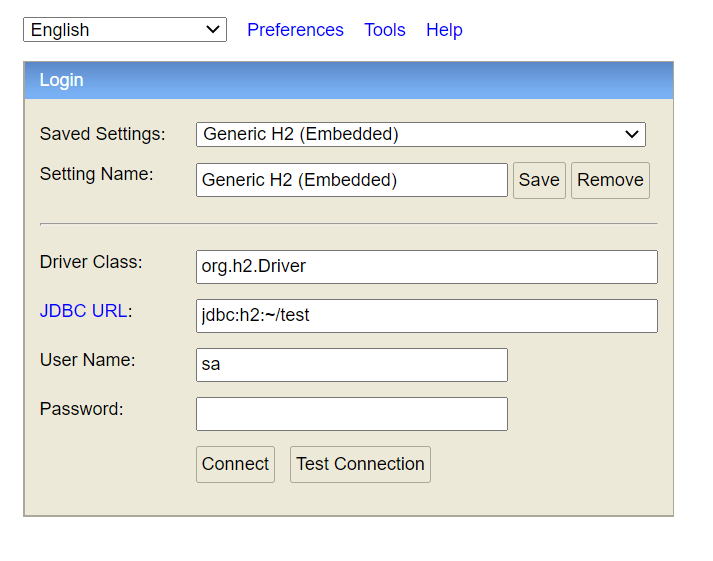 스프링을 작동시킨 뒤에 웹 주소창에 localhost:8080/h2-console 을 입력하면 아래와 같은 창이 뜬다.