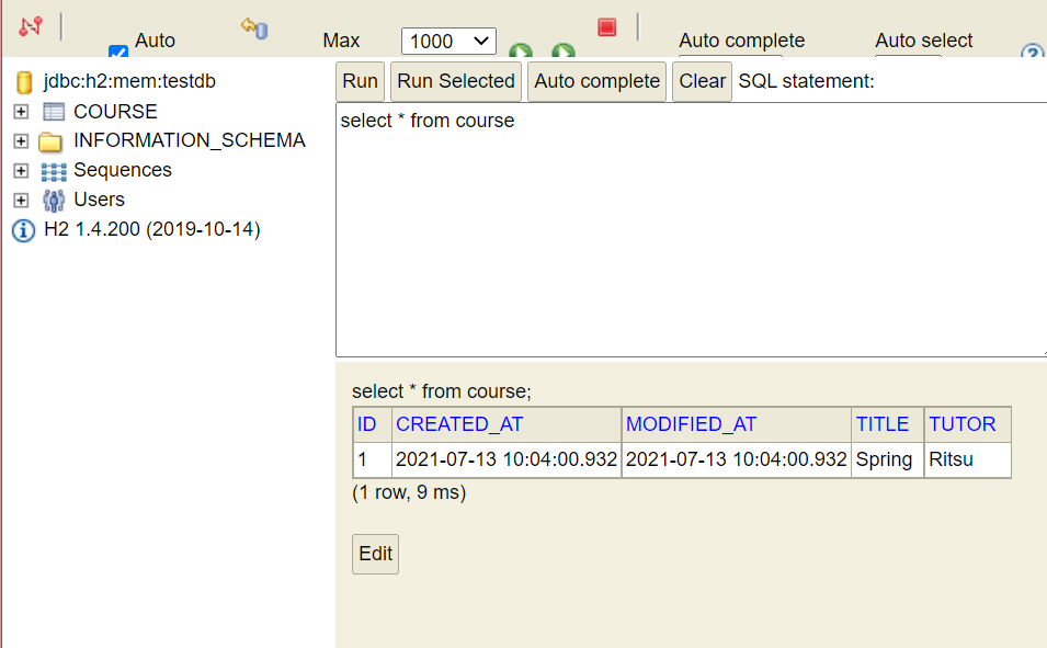 h2-console에서 select * from course 를 입력하면 생성일자와 수정일자를 확인할 수 있다.