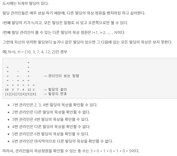 스택에 값이 남아있으면 그것도 처리해줘야 해서, 즉, 더 큰 수를 만나지 못한 빌딩은 남아있는 다른 빌딩을 다 볼 수 있기 때문에 마지막 인덱스 값인 n에서 스택에서 꺼낸 인덱스 값을 빼줘야 한다.