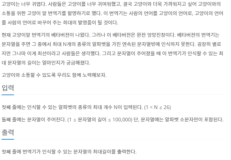 그리고 while문을 빠져나온 뒤에도 만약에 n이 알파벳 숫자 갯수보다 크면 조정해주고, 크지 않으면 현재 설정된 lenS 문자열의 길이를 answer에 설정해서 출력한다.