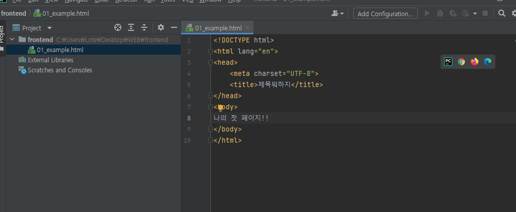 그리고 new 버튼을 이용해 html 코드 파일을 생성해주면 아래와 같은 창이 나온다.