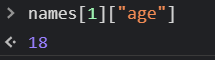 11. names의 값들 중에서 인덱스 1에 있는 age 값을 가져오기 위해서는 names[1]["age"] 라고 하면 18이라고 출력이 된다.
