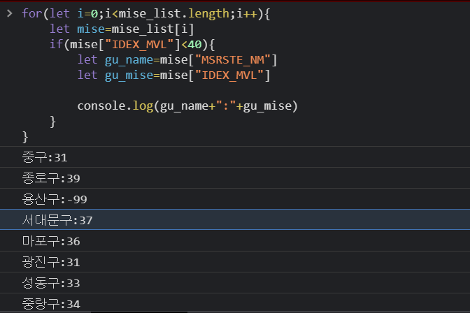그리고 반복문을 이용해서, 미세먼지 수치가 40미만인 구의 이름과 미세먼지 농도를 출력하고자 한다.