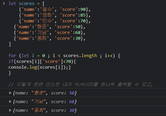 위는 scores 라는 리스트 딕셔너리 구조를 이용해서 학생들의 이름과 성적을 넣어주었다. 그 후에, for 반복문을 이용해서, 0부터 scores의 길이(=6)까지 차례대로 반복을 하는 반복문을 만들어주었다. 그리고, 반복문 안에 if 조건문을 넣어서 성적이 70미만인 학생들의 딕셔너리를 하나씩 출력할 수 있게 만들어 준다.