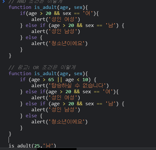 조건문에는 > < = 연산자와 더불어 AND 연산자, OR 연산자, NOT 연산자 또한 사용할 수 있다. AND 연산자는 &&를 기준으로 앞에 있는 조건과 뒤에 있는 조건이 해당할 때 참이되고, OR 연산자는 ||를 기준으로 앞에 있는 조건, 뒤에 있는 조건 중 둘 중 하나만 해당되면 참이 된다고 할 수 있다. NOT 연산자는 ! 를 기준으로 사용할 수 있으며, 값의 역을 반환한다. 즉, 참이면 거짓값을, 거짓이면 참값을 반환한다.