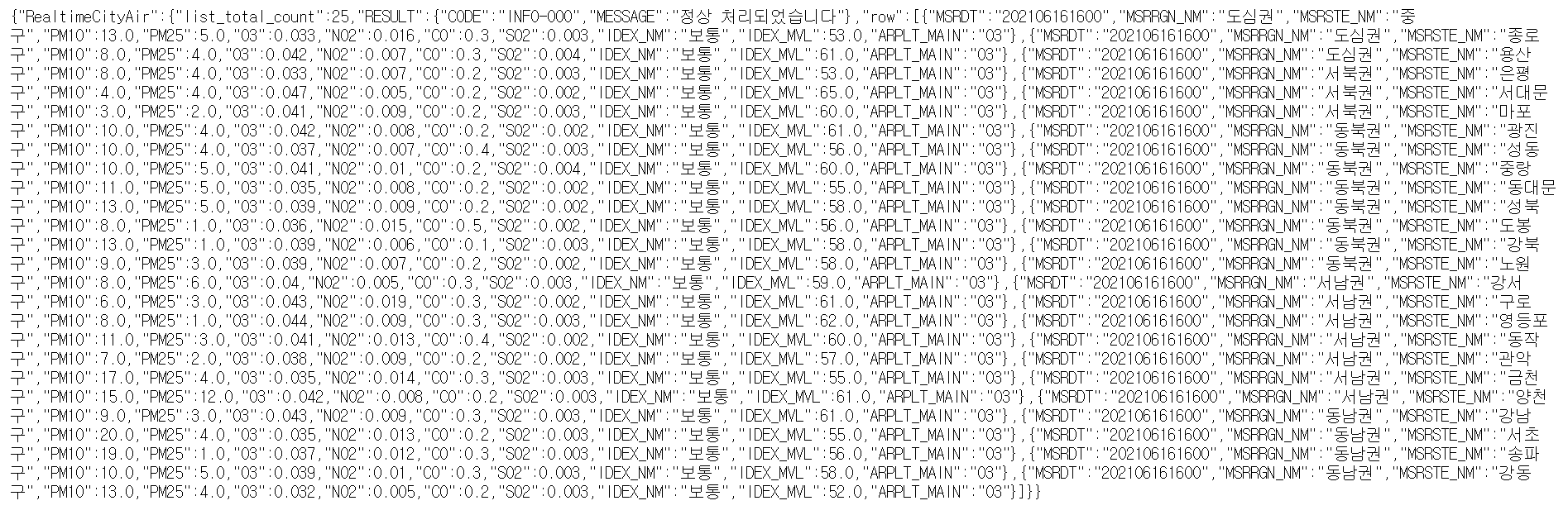*서울시 미세먼지 정보가 나와있는 url: http://openapi.seoul.go.kr:8088/6d4d776b466c656533356a4b4b5872/json/RealtimeCityAir/1/99