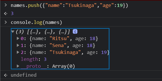 10. 리스트 안에 있는 딕셔너리 값을  추가하고 싶으면, 마찬가지로 push를 이용하면 된다.