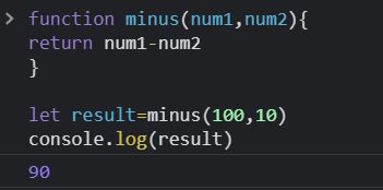 minus함수는 return을 이용해서 num1-num2의 결과값을 반환해주게 된다. 이 결과값을 출력하기 위해서는 위와같이 result라는 변수를 선언해준뒤에 minus함수에 변수 num1과 num2의 값을 설정해준 뒤, console.log()를 이용해서 출력해주게 된다. 결과는 90으로 제대로 나온 것을 확인할 수 있다.