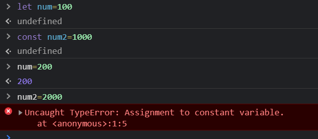 7. 앞서, 변수를 설정하는 함수로 let을 배웠다. 변수를 설정하는 함수로 const 도 존재한다. 위의 이미지와 같이, num 변수에 100을 넣고, num2 변수에 1000을 넣은 뒤에 num에는 200으로 재설정해주고, num2에는 2000으로 재설정해주려고 했다. 그런데, num 변수값을 바꾸는 과정에서는 오류없이 잘 나타났는데 num2 변수값을 바꾸는 과정에서는 오류가 나타났다. 이는, const를 이용해서 값을 설정해주었기 때문인데, 이와 같이 const를 이용해서 변수를 설정해주면 값이 바뀌지 않는다는 특징이 있다.