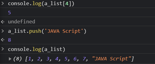 4. 리스트에 값을 추가해서 넣고 싶으면 push를 이용하면 된다. a_list라는 리스트에 JAVA Script라는 문자열을 추가로 넣어서 설정하고 싶으면 a_list.push('JAVA Script') 라고 하면 된다.