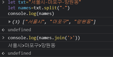 현재 문자가 서울시-마포구-망원동으로 나누어져 있는데, 이를 split()함수를 이용해서 -를 기준으로 문자열을 각각 나눈다. 그 후에, join()함수를 이용해서 서울시, 마포구, 망원동으로 나눈 문자열을 부등호를 이용해 나타낼 수 있다.