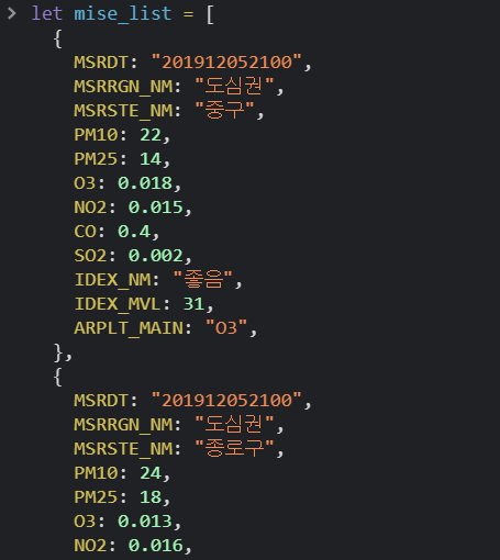 해당 사이트의 리스트 딕셔너리 구조를 긁어와서 mise_list라는 이름의 리스트를 만들어 설정한다.