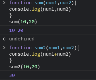 sum 함수는 단순히 num1과 num2라는 변수를 받아서 출력해주는 함수이고, sum2는 num1과 num2를 받아서 더하기 연산을 해서 그 결과 값을 출력해주는 함수이다.