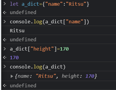 7. dictionary에 담겨있는 값을 출력하기 위해서는 키 값을 불러줘야 한다. 예를 들어, a_dict라는 딕셔너리에 담긴 Ritsu를 출력하고 싶으면 console.log(a_dict["name"]) 을 쓰면 제대로 Ritsu가 출력되는 것을 알 수 있다.