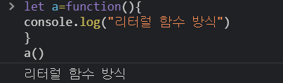 어떤 특정한 변수를 선언해준뒤에, 함수를 선언해줄 수도 있다. 위는 a라는 변수를 선언하고 그 변수에 "리터럴 함수 방식" 이라는 글자를 출력하도록 한 함수를 선언해줌으로써, a에 그 함수가 담겨지게 된 것이다. a()라고 쳐주면 해당 함수의 결과값이 출력된다.