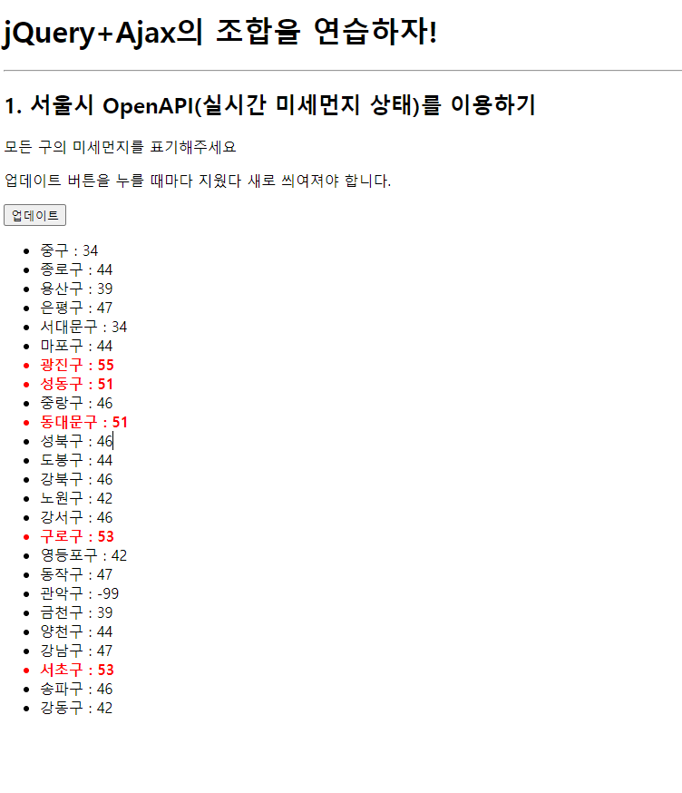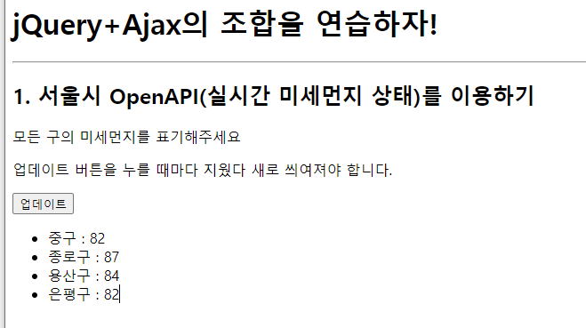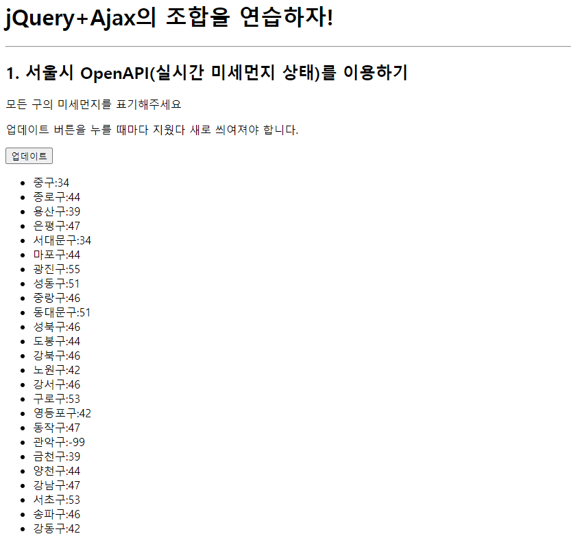 업데이트버튼을 누르면 구 이름과 해당 구의 미세먼지 값이 나오는 페이지 만들기
