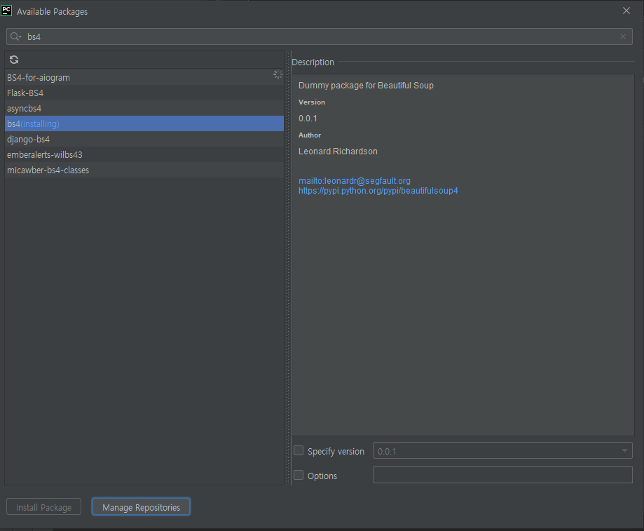 파이참->File->Setting->requests 패키지 설치, bs4 패키지 설치