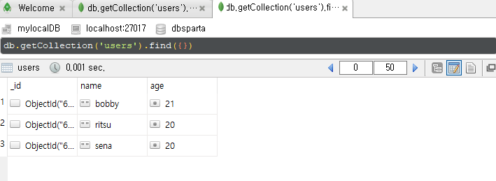 dbsparta를 클릭, collections클릭한 후, view results in table mode를 클릭하면