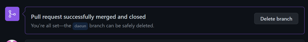그 다음 pull request를 성공적으로 진행해서 merge까지 완료가 되면 해당 branch를 삭제한다.