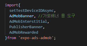 전면 광고배너는 보고 싶은 팁을 눌렀을 때, 디테일 페이지를 보기 전에 광고를 볼 수 있게 전면 배너를 달아둔다. 그러면 Card.js에 전면 배너를 달면 된다. 하단 광고 배너를 달았을 때와 마찬가지로, 상단에 광고 도구를 추가해준다. 전면 배너는 AdMobInterstitial을 사용한다.