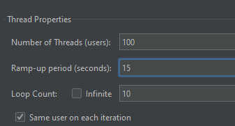 위와 같이 설정하게 되면 100명의 유저가 동시에 15번 반복하여 10초 간 action을 취할 때이다.