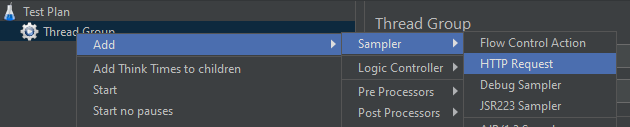 Thread Group->Add->Sampler->HTTP Request를 선택해 Sampler를 설정한다.